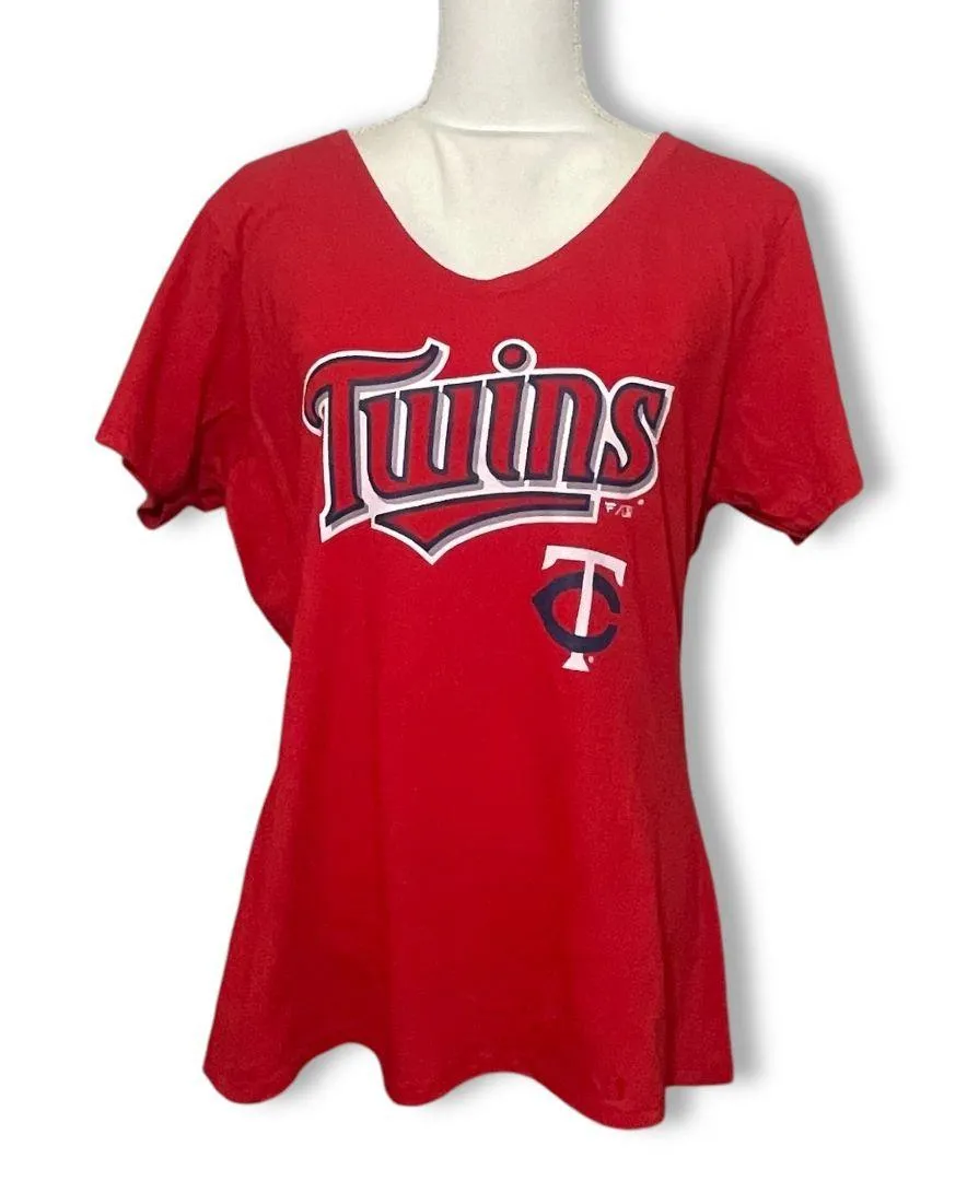 NWOT: brand new without tags Bright red v-neck short-sleeve tee t-shirt top featuring a front Minnesota Twins screenprint. Ladies’ size XL extra-large. 100% cotton ring spun fabric, standard t-shirt amount of stretch. Officially licensed MLB Apparel. By Fanatics.