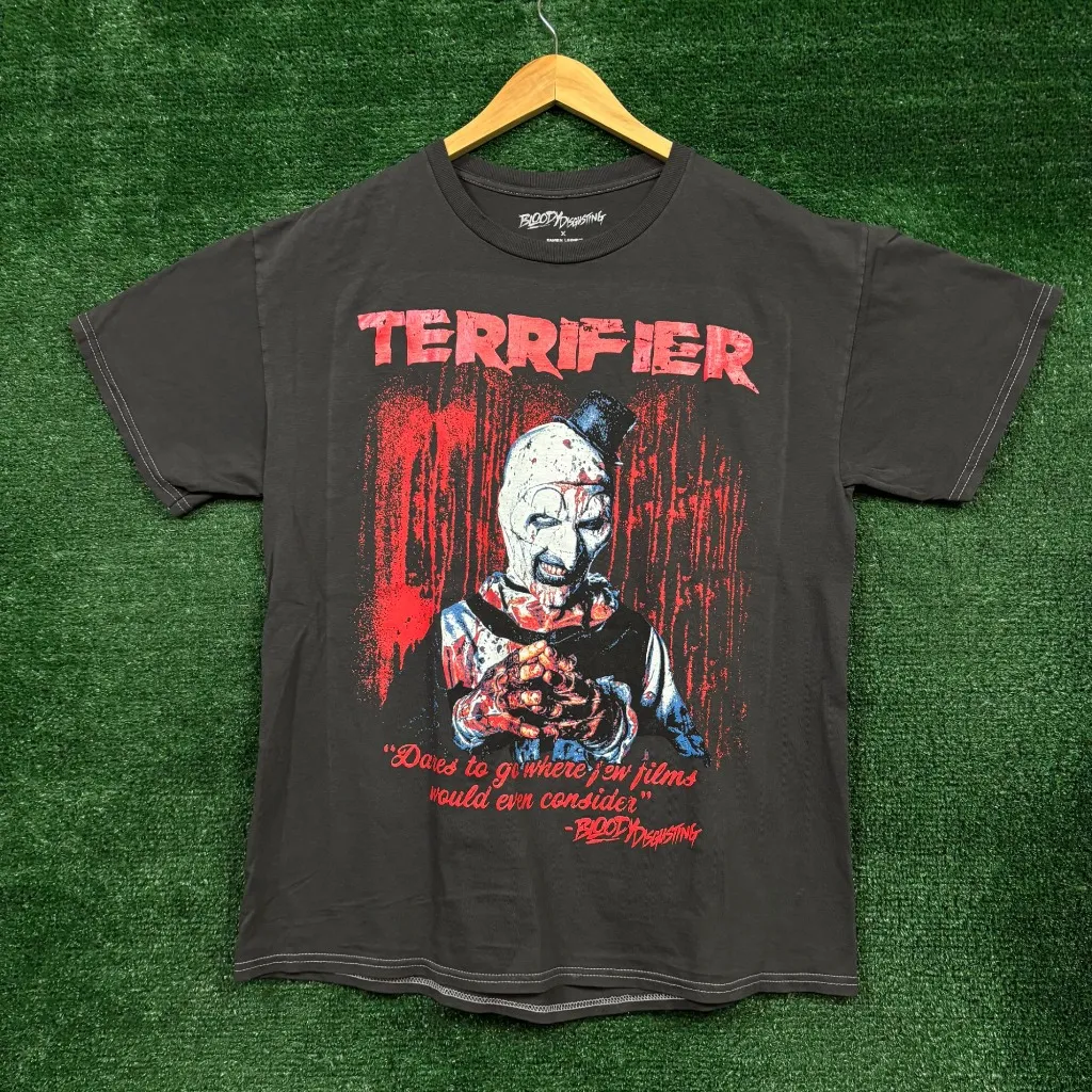Bloody Disgusting x Terrifier Art the Clown Horror Tee M measures 22 inches pit to pit 27 inches long Amazing tee with graphics on both sides of the tee perfect for Terrifier fans Firsthand overstock in great condition damaged by manufacturer