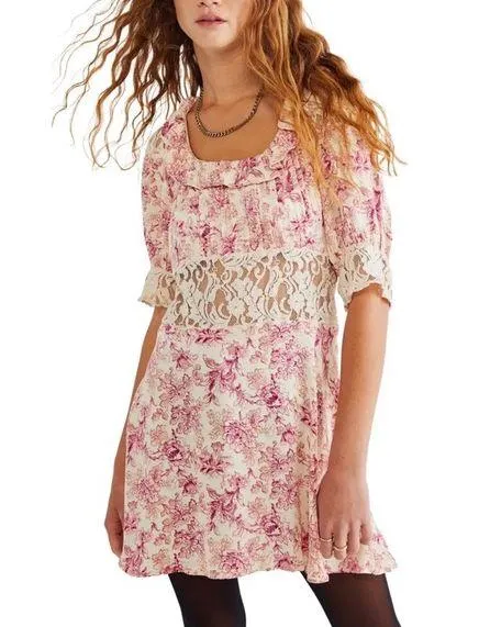 New without Tags Free People Luci Mini Dress Size: 8 Color: Tea combo (Pink Floral & Ivory Lace) Fo... Show more