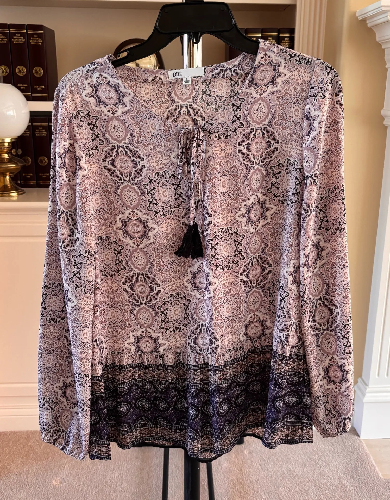 DR2 by Daniel Rainn boho blouse with a tassel tie neck and a printed pattern Size Small Pre-Owned DR2 by Daniel Rainn boho blouse with a tassel tie neck and a printed pattern Size Small Pre-Owned