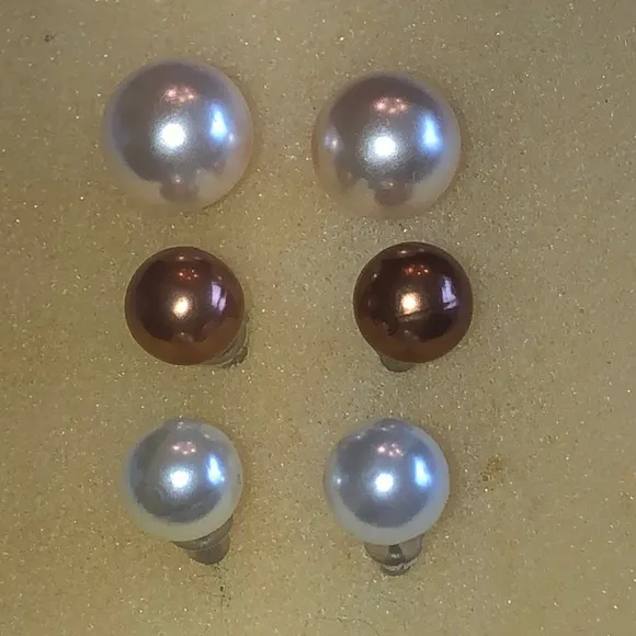 Set of elegant faux pearl stud earrings in white, cream, and brown. Perfect for any occasion. Good c... Show more