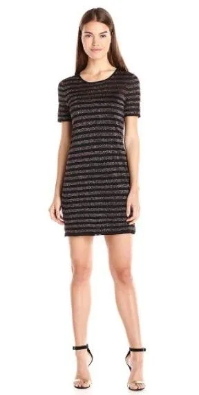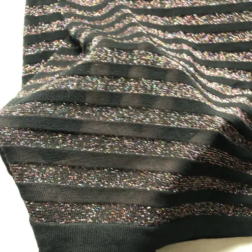 TRINA Trina Turk Short Sleeve Shirt Dress. Semi sheer rainbow Metallic and Black Striped detail. Sco... Show more