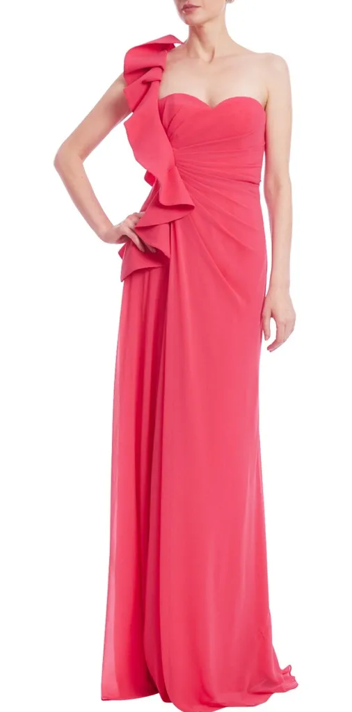 Brand: Badgley Mischka Size: 0 Color: Poppy Sold out Retails for $1000 One Shoulder Strapless Floor Length The One-Shoulder Pleated Leaf Evening Gown is an elegant dress with a botanical twist—the waist is accented with sewn-in pleats that draw toward the ruffled strap over the right shoulder, creating the look of an opened leaf. Completed with a draped A-line silhouette and sweetheart neckline, this dress is perfect for a gala or any other springtime special event.