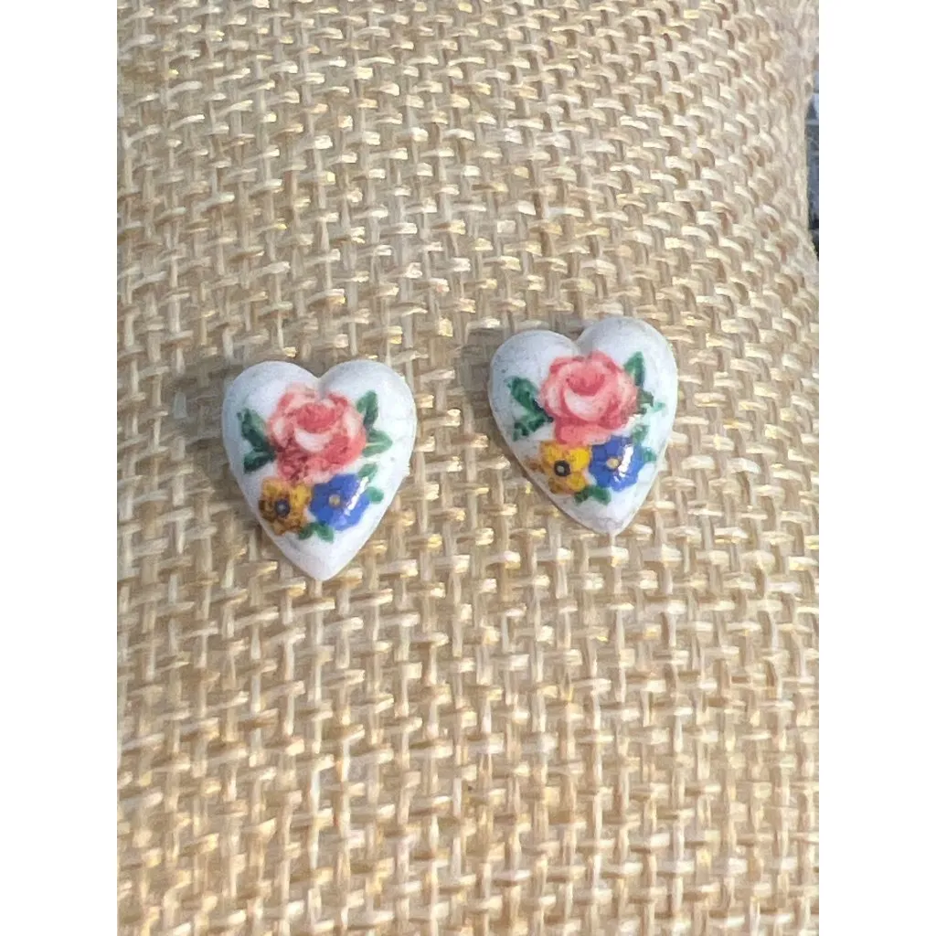 These elegant ceramic heart stud earrings feature a delicate floral motif, adding a touch of sophistication to any outfit. Ideal for daily wear or special occasions, they offer a timeless appeal. The sturdy posts ensure a secure fit, making them a dependable accessory choice. • Heart-shaped design • Secure stud style • Delicate floral pattern • Lightweight ceramic material • Versatile for various outfits Measure approx. 3/8" Great preowned condition