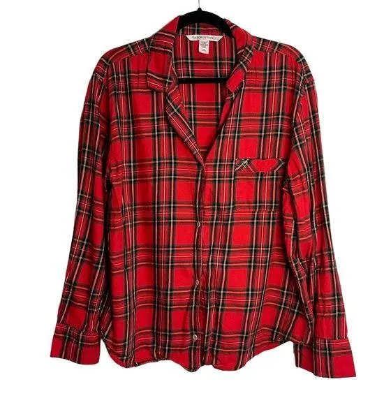 Victoria’s Secret Red Plaid Flannel Button Down Sleep Shirt Size Large Front chest pocket with hear... Show more
