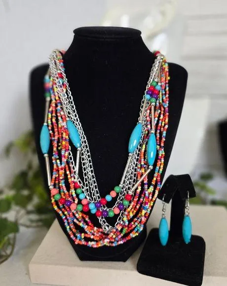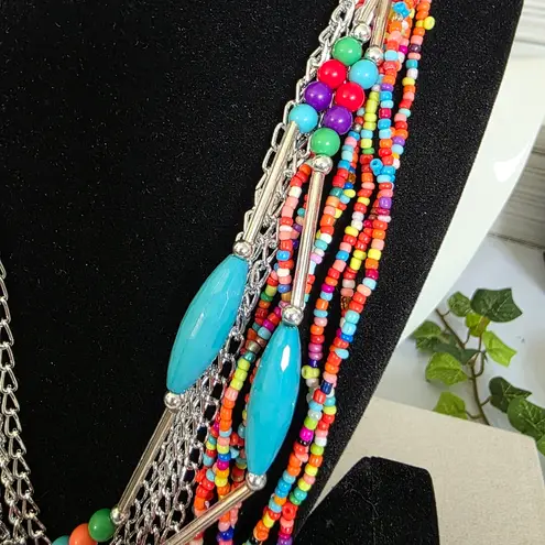 Beautiful and colorful necklace and earrings set Silver tone hardware Multi strand necklace features glass seed beads, acrylic beads and silver tone chains Measures 23" plus 3" chain extender Matching earrings hook style @Z bohemian boho turquoise colorful casual dressy work office simple classic timeless style everyday south western