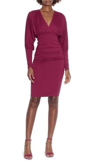 Ruched Long Dolman Sleeve Dress small Susana Monaco Selling on nordstrom for $178 Wine berry color New without tags never used Get set to stun in a curve-loving dress that flatters a feminine silhouette with a ruched waistline, V-neck and dolman sleeves with extra-deep cuffs. Slips on over head Surplice V-neck Long sleeves 95% nylon, 5% spandex Machine wash, dry flat Great for formal career party work