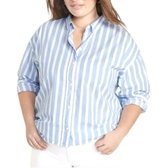 Long-Sleeve Oversized Cropped Striped Boyfriend Shirt from Old Navy in Blue Stripe. Button down spr... Show more