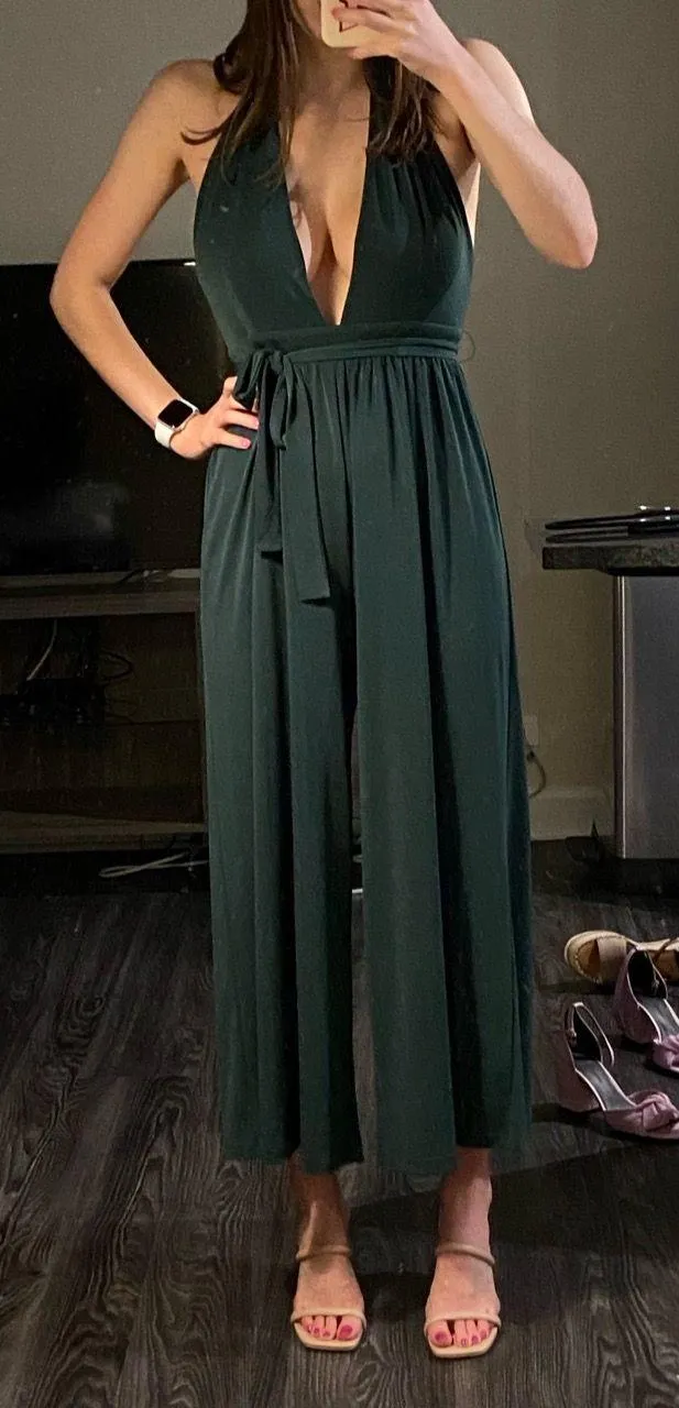 Adjustable tie at neck. Zipper on back. Backless. Deep plunge neck line. Removable adjustable tie be... Show more