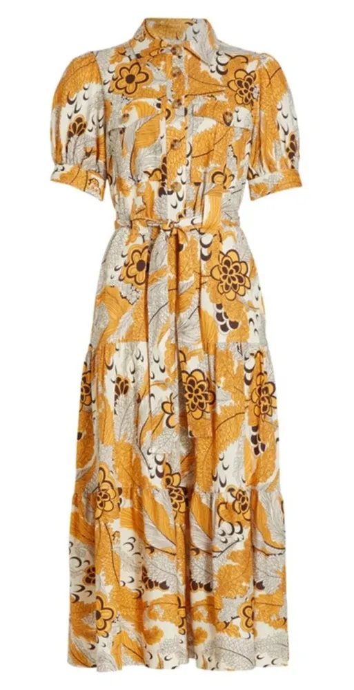 Spread collar 5 button placket Utilitarian inspired, chest pockets with button flap closure Tie at waist, built-in belt loops Side seam pockets Tiered, midi-length skirt 55% linen, 45% rayon; 100% cotton lining Excellent condition Size: 8 Bust: 19.5" Waist: 20.5" Length: 51"