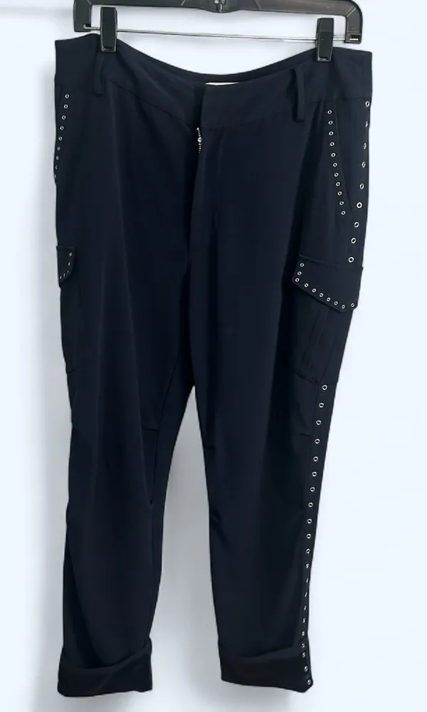 designer preppy old money trendy chic yacht nautical steampunk country club edgy avant garde great condition pockets, cargo style cropped with cuffed legs satin like lining pleats triacetate and polyester dry clean only 17" across the waist 38.5" total length 27" inseam high rise small spot, water mark, etc as shown on one leg, has not been treated, very minor, may come out with wash/treatment