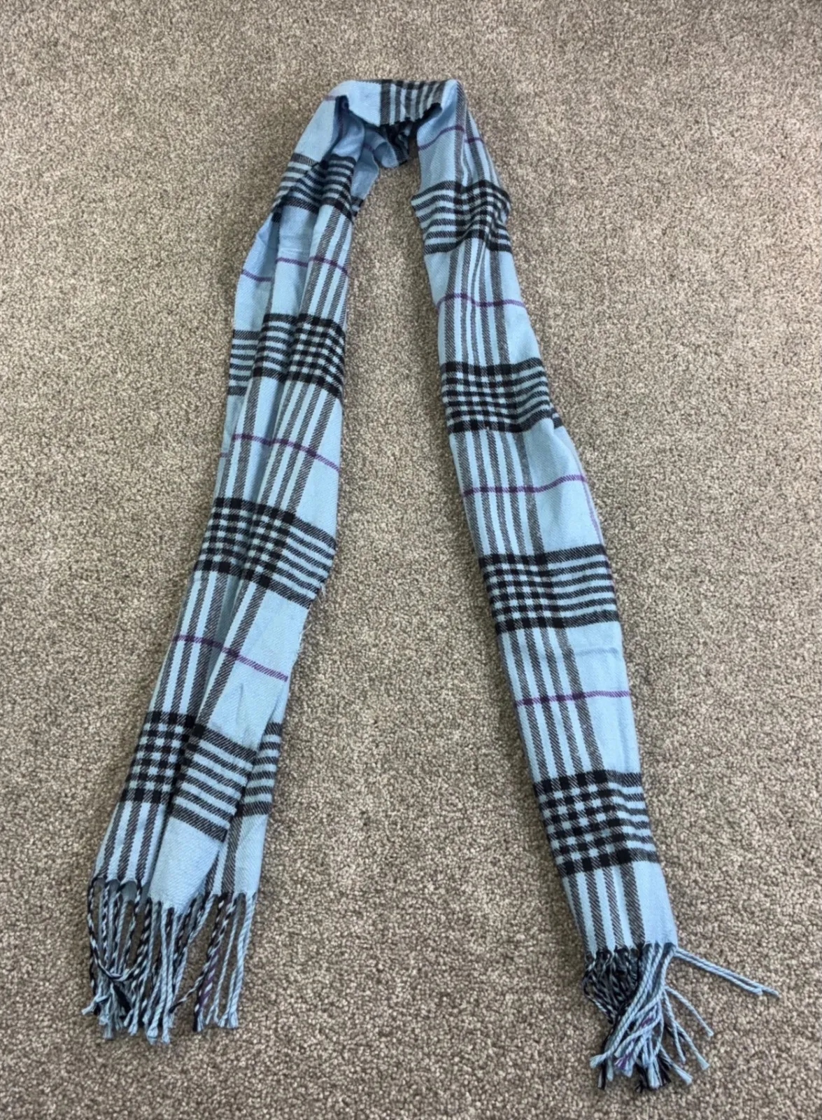See photo 4, there is a flaw on the edge. Measurements: • Length: 68 in without fringe • Width: 12 in Type: Scarf Department: Unisex Material: Cashmere Style: Rectangle Scarf Pattern: Plaid Fabric Type: Knit Accents: Fringe Season: Fall, Winter Unit Type: Unit Keywords: plaid scarf, cashmere blend, fringe scarf, winter accessory, fall fashion, light blue, fashionable, cozy, soft, everyday wear, gift idea, classic pattern
