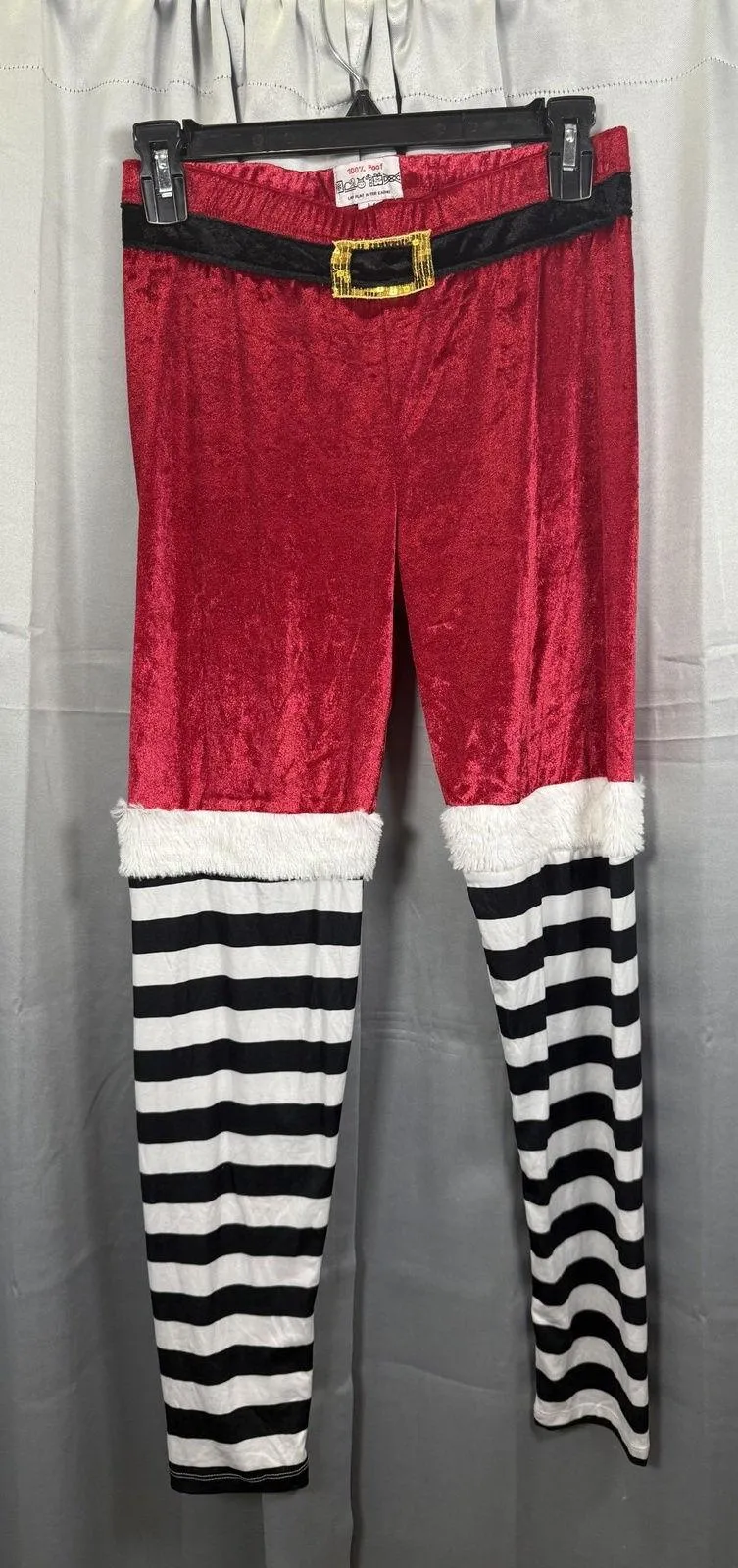 Brand: 100% Poof Item: Festive holiday leggings/pants with Santa belt and elf-inspired striped legs Gender/Size: Womens Medium (tag M) Colors: Red, Black, White Features: Soft velour-like knit; elastic waistband; sewn faux belt with gold buckle detail Features: White faux fur trim at knee; black-and-white striped lower legs Tag details: Brand tag shows "100% Poof" and size M Material/Care: Fabric content not listed on visible tags Occasion: Christmas, costumes, themed events, festive loungewear Notes: Review all photos for color and design details.