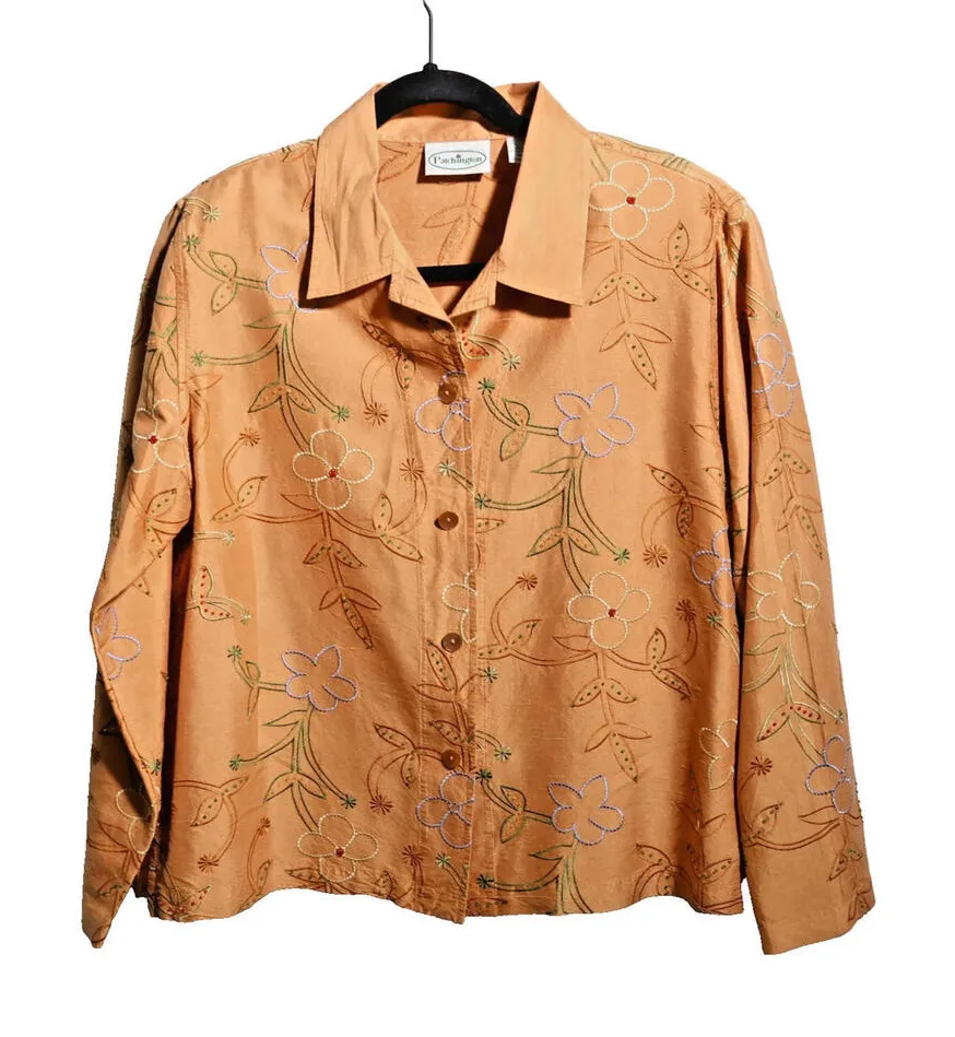 100% Silk Orange Button Up Shirt Jacket Embroidered Flowers Whimsical Fairy womens large l Patchingt... Show more