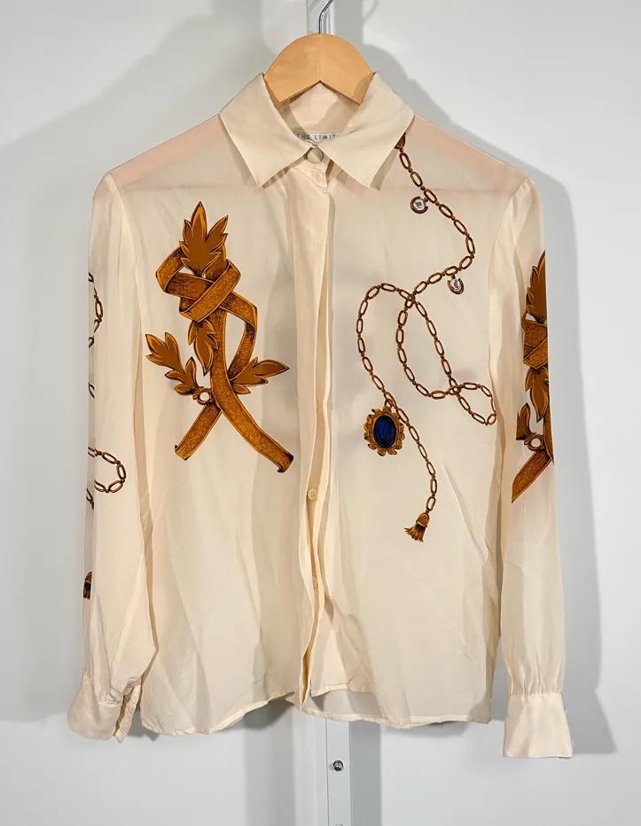 Beautiful vintage silk with that classic 80s/early-90s scarf-print vibe. The cream base, equestrian-... Show more