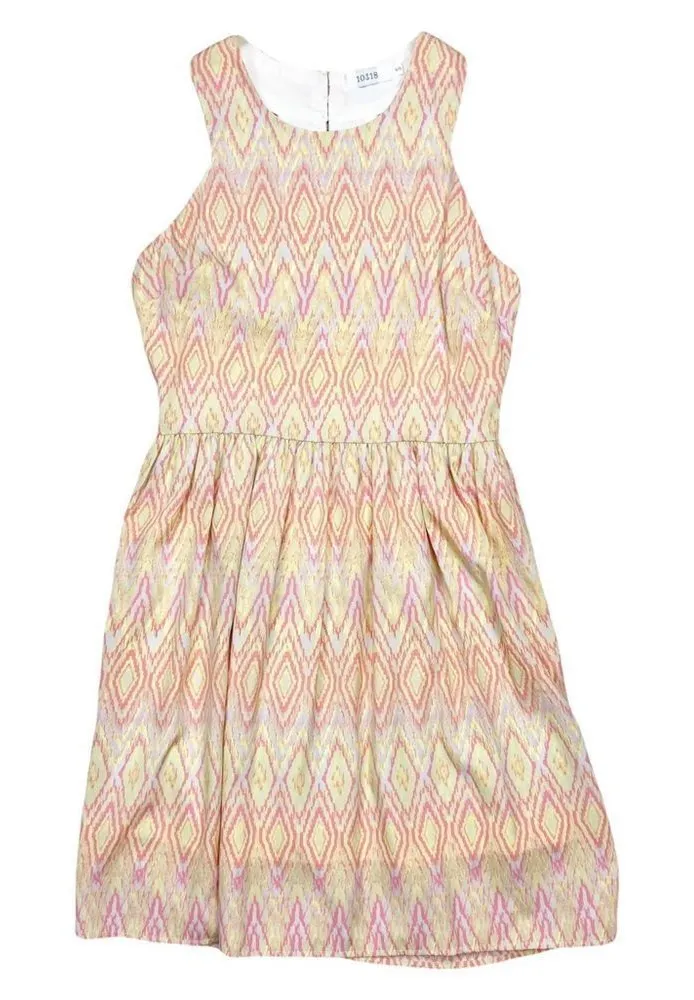 Super cute pre-worn 1018 Boutique pink and yellow diamond geometric zig zag halter sheath dress, siz... Show more