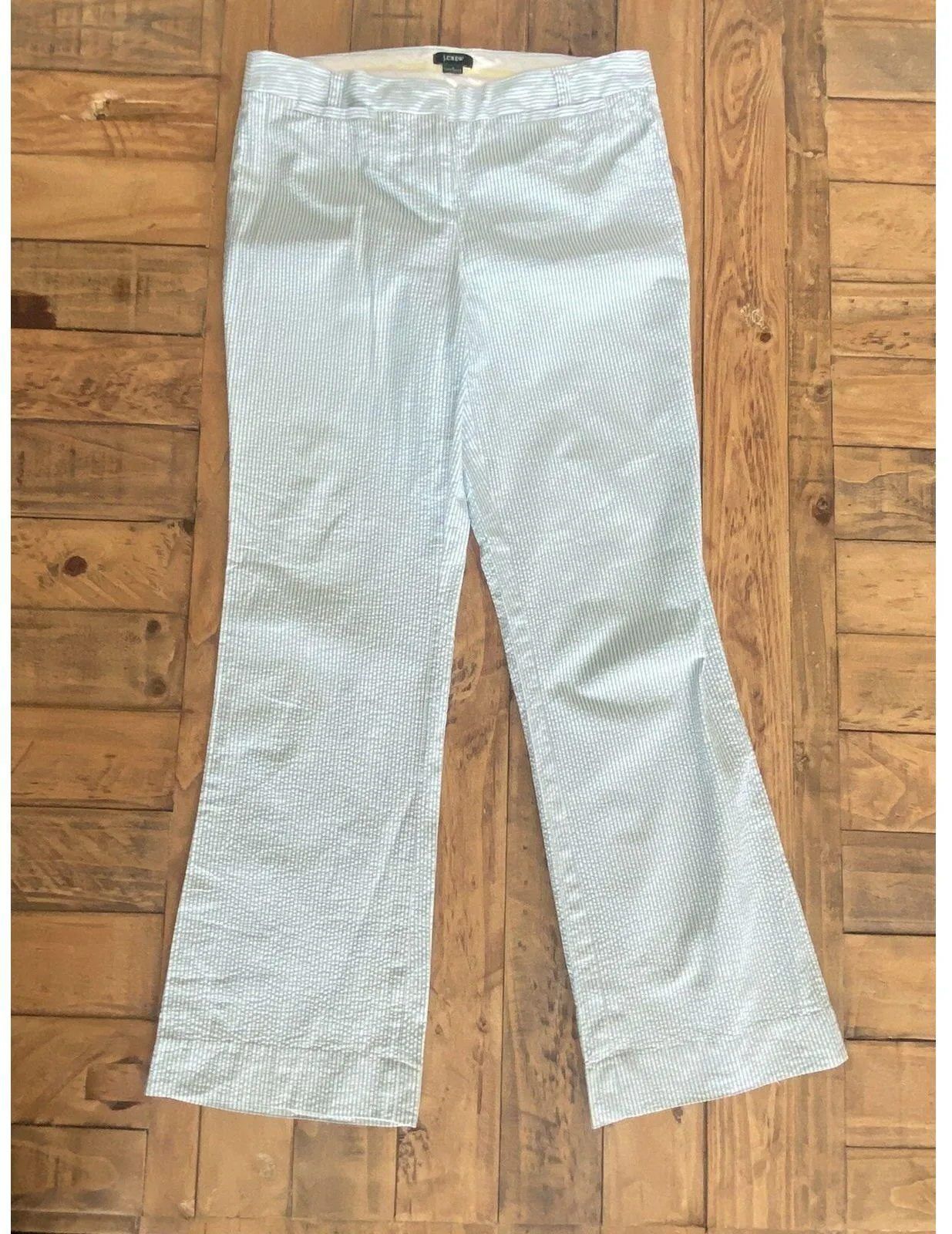 FEATURES Pants have been gently worn with no major stains, snags or tears. Pants feature a front button and zipper entry, small front pockets, two back pockets and belt loops. FLAWS N/A BRAND J.Crew TAG SIZE 4 COLOR Hues of Lt. Blue and White SHELL FABRIC 100% Cotton APPROXIMATE MEASUREMENTS Inseam: 28.5" Waist (across, laying flat, unstretched): 15" Length: 37" Top Thigh (across): 9" Hip: (across, flat): 17" Bottom leg opening (across, flat): 9"