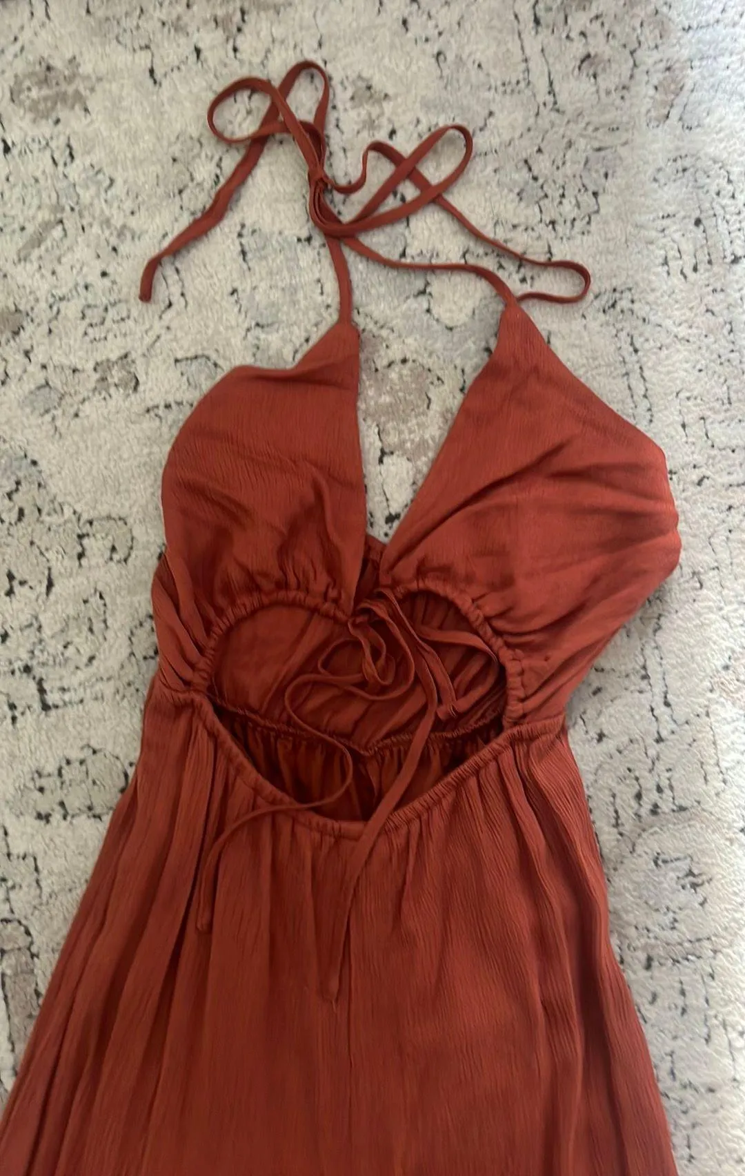 A light weight one piece, burnt orange in color. Halter top, with open belly area. From 12th tribe.... Show more