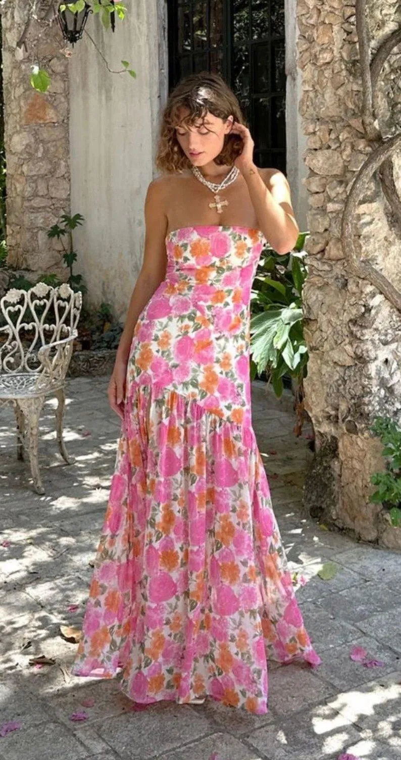 LaBelle strapless drop waist pink floral maxi dress Worn once to a wedding, in perfect condition an... Show more