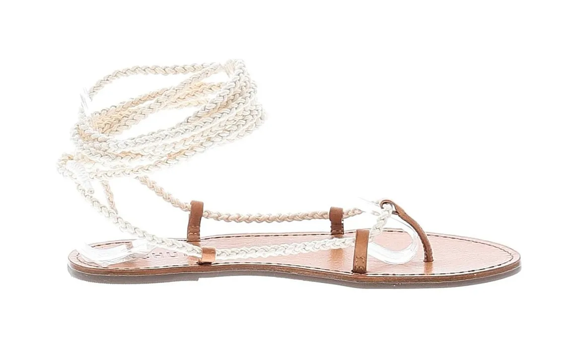 Step into summer with these chic SCHUTZ Giorgia sandals, designed to elevate your warm-weather wardrobe. The rich tan leather footbed offers a luxurious feel, while the unique braided rope wraps elegantly around your ankle, creating a sophisticated and eye-catching detail. Perfect for beach strolls, vacation evenings, or adding a touch of artisanal flair to your everyday outfits. Style: Strappy Department: Women Upper Material: Leather UK Shoe Size: 4 AU Shoe Size: 6 Heel Style: Flat EU Shoe Size: 37 Features: Straps, Ankle Strap, Adjustable Strap Closure: Tie Pattern: Solid Heel Height: Flat (Under 1 in) Type: Sandal Product Line: Schutz Insole Material: Leather Outsole Material: Rubber Keywords: Schutz sandals, Leather sandals, Rope tie sandals, Ankle wrap sandals, Flat sandals, Summer sandals, Bohemian sandals, Nautical sandals, Vacation shoes, Beach sandals, Womens sandals