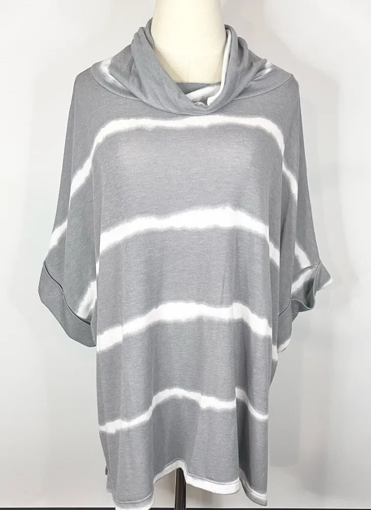 Women’s 143 STORY // LINE UP Gray White Striped Mock Neck Pullover. Short sleeve. Dolman style. Oversized fit. Split hems. Stretchy. Size: Small Style #: TY4463D Condition: EUC Fabric content: 63% polyester 33% rayon 4% spandex Flat lay measurements (approximate): Shoulder to Shoulder: 38” Chest: 31” Waist: 30” Hem: 30.5” Length: 28” Sleeve length: 15.5” Note: Pullover is featured on a size SMALL mannequin.