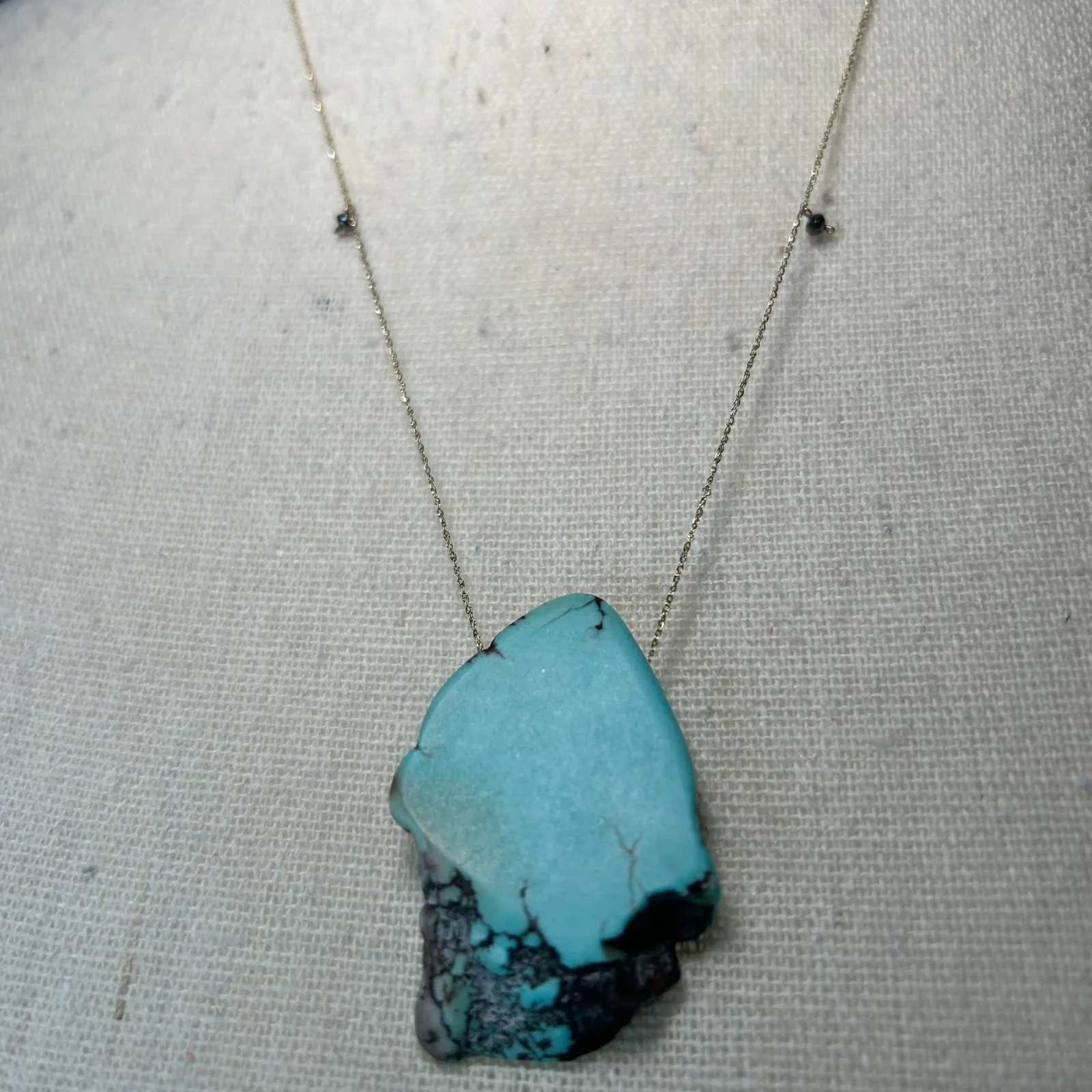 Elegant and unique 14k yellow gold necklace featuring delicate black diamond chip accents along the chain and a bold faux turquoise pendant with natural veining. Chain: 14k solid yellow gold (tested), spring ring clasp Accents: Two genuine black diamond chips Pendant: Faux turquoise stone (dyed composite), organic freeform cut Length: Chain Approx. 20" Stone Approx 1.5" x 1" Condition: Excellent pre-owned, no visible flaws A striking mix of fine gold and artisan design — perfect for layering or as a statement piece. Keywords 14k gold necklace, black diamond necklace, turquoise pendant necklace, artisan jewelry, boho chic jewelry, gold chain necklace, statement pendant necklace, turquoise look necklace, layering necklace, gift for her, festival jewelry