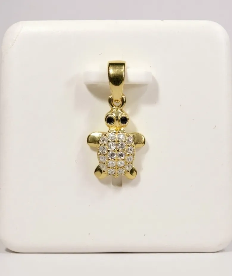 Charming 14k gold plated sterling silver turtle pendant, shimmering with dazzling moissanite gemston... Show more