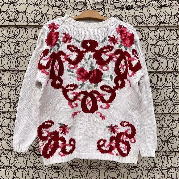 Vintage 90s Nuggets floral scroll knit sweater red and pink scroll pattern over cream base knit sweater Ramie Cotton Blend Size medium do have various marks of discoloration, some of the yarn cast offs have come loose and have been retied, others may need tied ( i tried to tie off all the loose ones i could find) Flat measurements are approximate Pit to pit 21 inches shoulder to hem 25 inches shoulder seam to wrist 19 inches