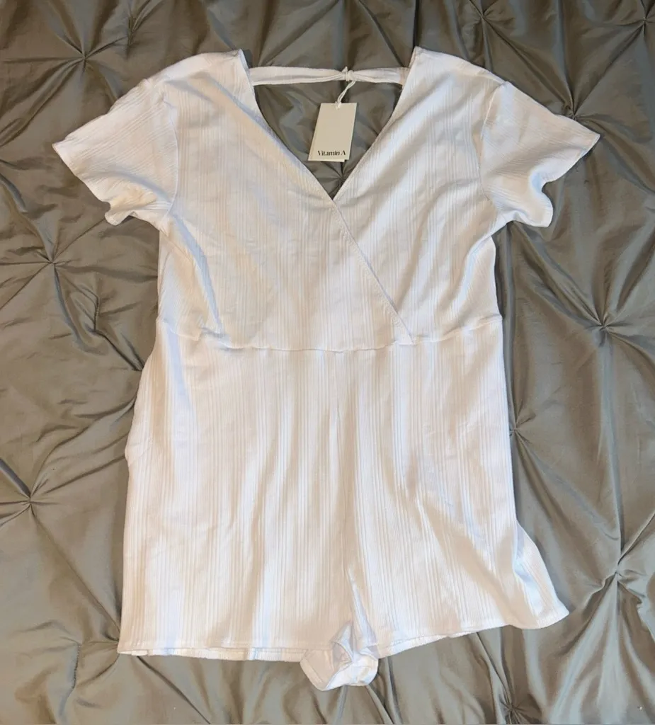 The $158 Vitamin A Women's White Logan Organic Rib V-Neck Romper in size M is a stylish and versatil... Show more