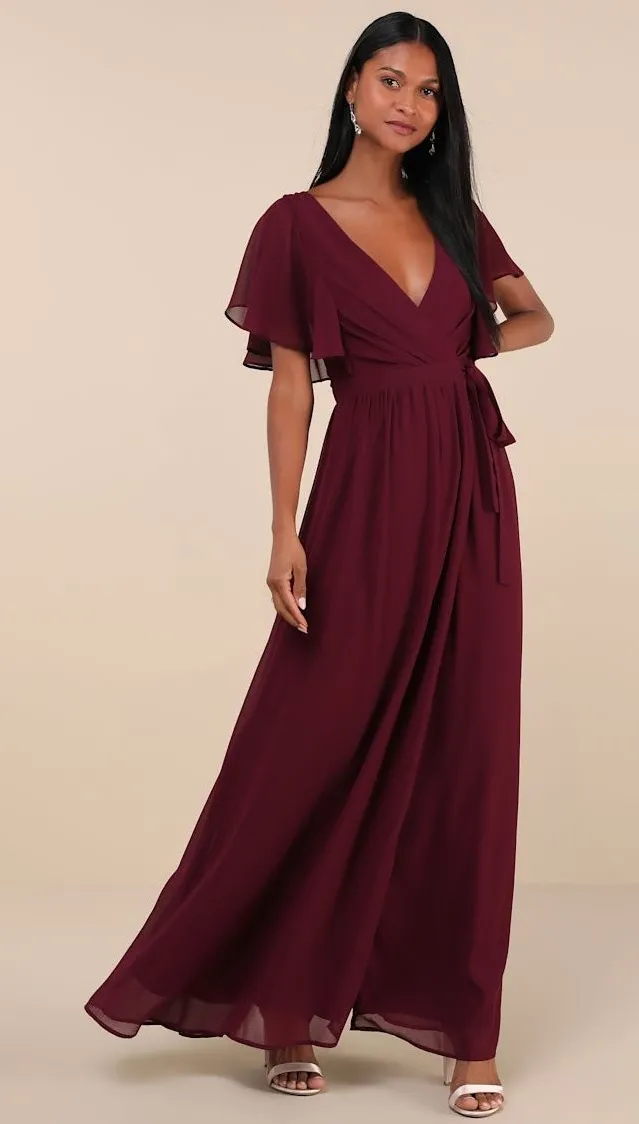 Stroll effortlessly into the venue, knowing you look stunning in the Lulus Convincing Grace Burgundy Flutter Sleeve Wrap Maxi Dress! Lightweight woven chiffon shapes short flutter sleeves that frame a surplice bodice with subtle pleating and a low V-back. Internal ties thread through the banded waist, securing the wrap silhouette. Skirt has a flaring, overlapping design that falls to a maxi hem.