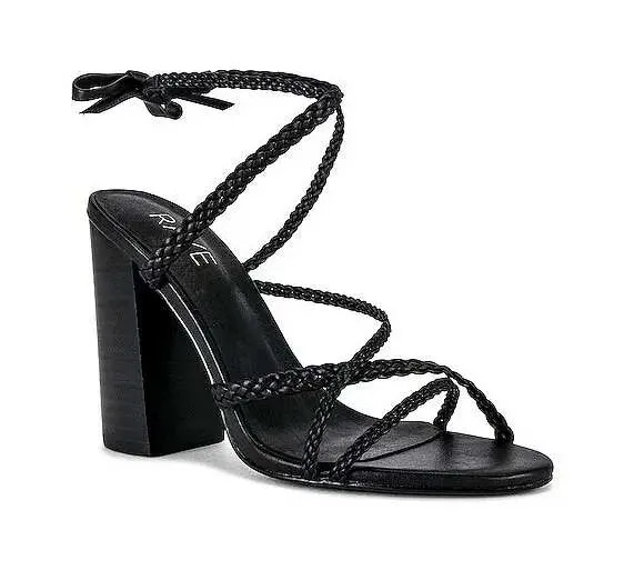 Elevate your style with these stunning RAYE black braided lace-up sandals. The chic braided detailing adds a touch of bohemian flair, while the secure lace-up closure ensures a personalized fit. The substantial block heel provides both comfort and a confident lift. These beauties are perfect for a summer wedding, glamorous evening out, or a stylish brunch date. Measurements: • Heel: 4 inches Style: Strappy Department: Women Upper Material: Leather Heel Style: Block Features: Ankle Strap, Adjustable Strap Closure: Lace Up Pattern: Solid Accents: Braided, Bow Model: RAYE Strappy Block Heel Sandals Keywords: RAYE sandals, black lace up heels, braided strappy sandals, women's block heels, dressy sandals, wedding guest shoes, evening sandals, summer fashion, designer heels, ankle wrap sandals, chic sandals, fashionable footwear, statement heels