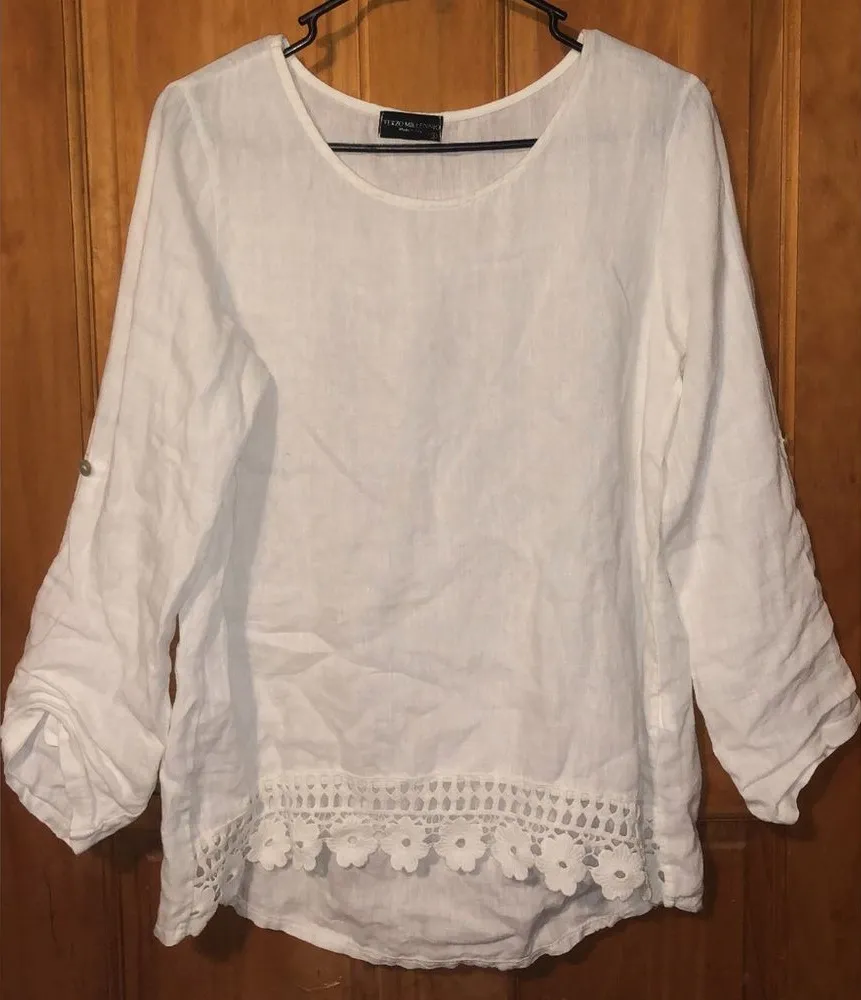 Experience effortless style with the Frank & Eileen Cream Blouse, featuring a relaxed fit and elegant 3/4 sleeves. The simple round neckline and voluminous sleeve detail add a touch of sophistication to this versatile top, perfect for both casual and dressier occasions. Pit to pit 18” 100% linen Made in italy