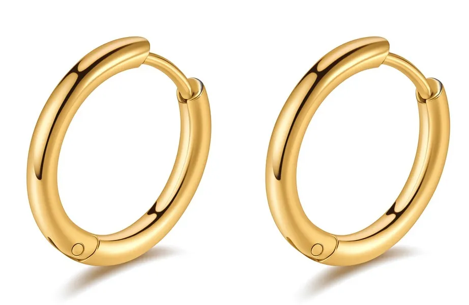 18K Gold Plated 14mm Huggie Hoop Earrings – Stainless Steel, Hypoallergenic These 14mm huggie hoop earrings are crafted from durable stainless steel and plated in rich 18K gold for a luxurious shine. Featuring a sleek, hinged design for easy wear, they are lightweight, tarnish-resistant, and hypoallergenic—perfect for everyday elegance or layering with other piercings. Stylish, secure, and skin-friendly, these hoops are a timeless must-have.