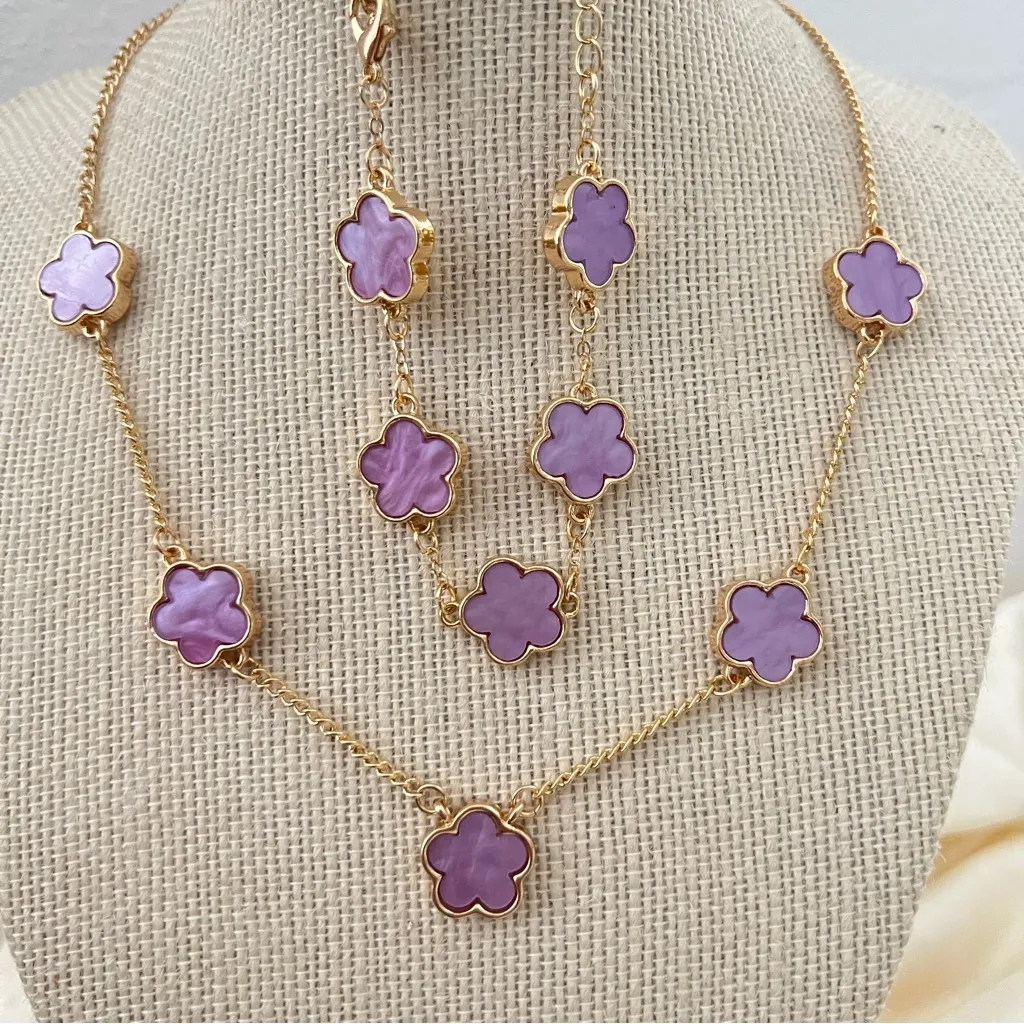 Brand NEW! Elegant gold necklace set featuring charming purple clover flower accents. Perfect for ad... Show more