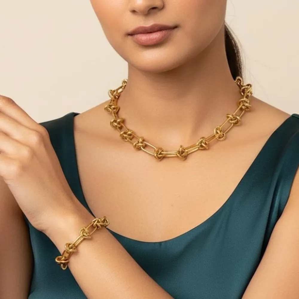 Brand NEW! 18k Plated Gold Knot Chain Necklace and bracelet set Stainless Steel Y2K SIZE: 16”+ 2” Gold plating on Stainless steel Stainless steel is a good quality jewelry • Tarnish Resistant Nickel and Lead Free High quality materials and will last. The stainless steel gold finish is entirely safe to wear. Jewelry made does not tarnish hypoallergenic Stainless steel with Base Stainless steel jewelry doesn’t turn your skin green or cause any allergic reaction, making it the ideal option for people who enjoy living active lifestyles. Tags: Neiman Marcus, Beauty, Family & Friends, Love, Trendy, Y2k, Modern, Aesthetic, Coquette, Fashion, Chic