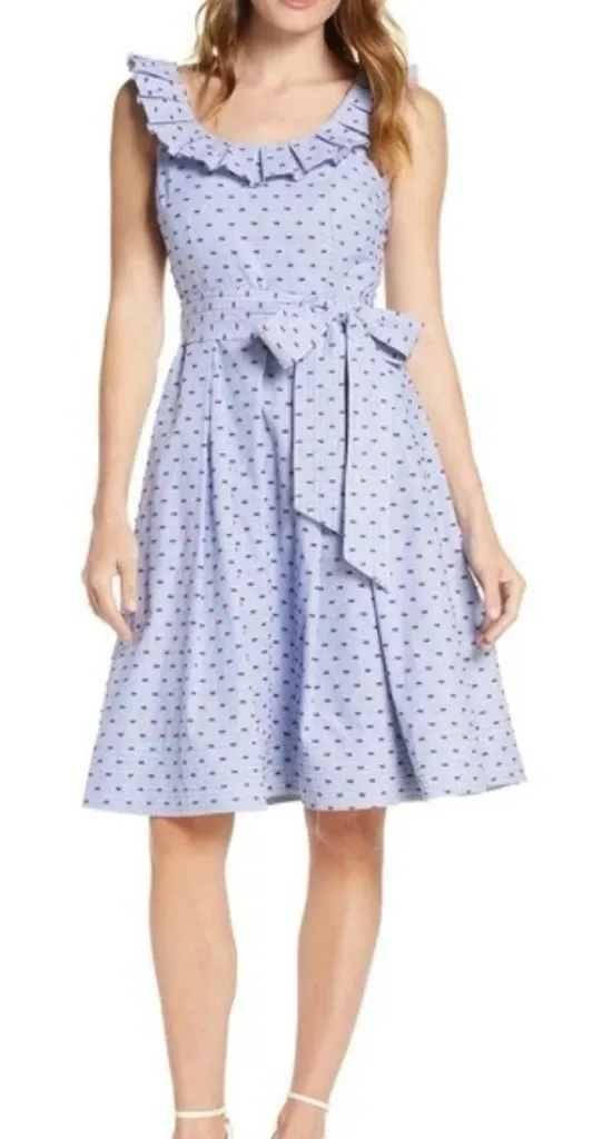 • Style: Fit and flare, classic, vintage-inspired • Brand: 1901 • Size: 2 Petite • Condition: New without tags • Fabric Content: 100% cotton • Measurements: – Length: 36 inches – Pit to pit: 16.25 inches – Waist: 12.75 inches • Special Details: Sleeveless silhouette, textured seersucker-style stripe, back zip closure, functional pockets, removable sash tie, fully lined for structure and comfort