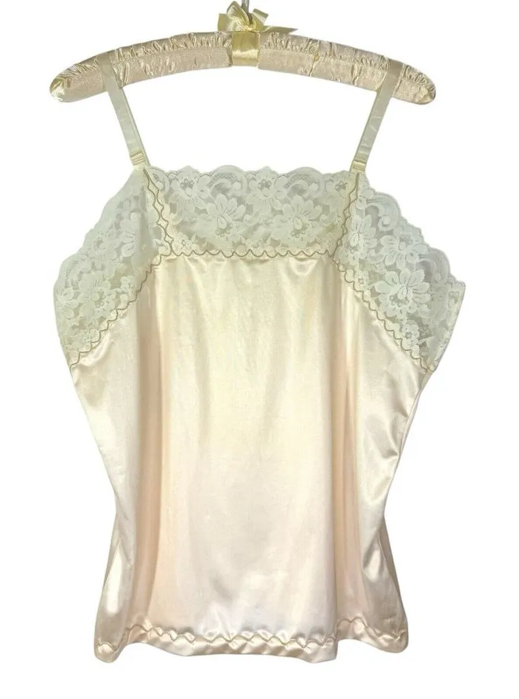 1950's Camisole Opalaire L Ivory Lace Cami Fairy Dainty Coquette Retro Nylon Excellent condition Adjustable straps Wide lace hem Satin 100% Nylon Assembled in Haiti of US materials Decorative stitching See photos for approximate measurements (taken lying flat without stretching). Ships within 24 hours Tags: Comfy, Soft, Versatile, All Seasons, Timeless, Easy To Wear, Dress Up Or Down, Casual, Party, Date Night, Feminine, Unique, Romantic, Forest, Fairy, Whimsigoth, Undershirt, Layering, Neutral, Coquette, Clean Girl, Whimsy, Vintage, Retro, 1950, 1960, Housewife, Lingerie, Cami, Slip Shirt