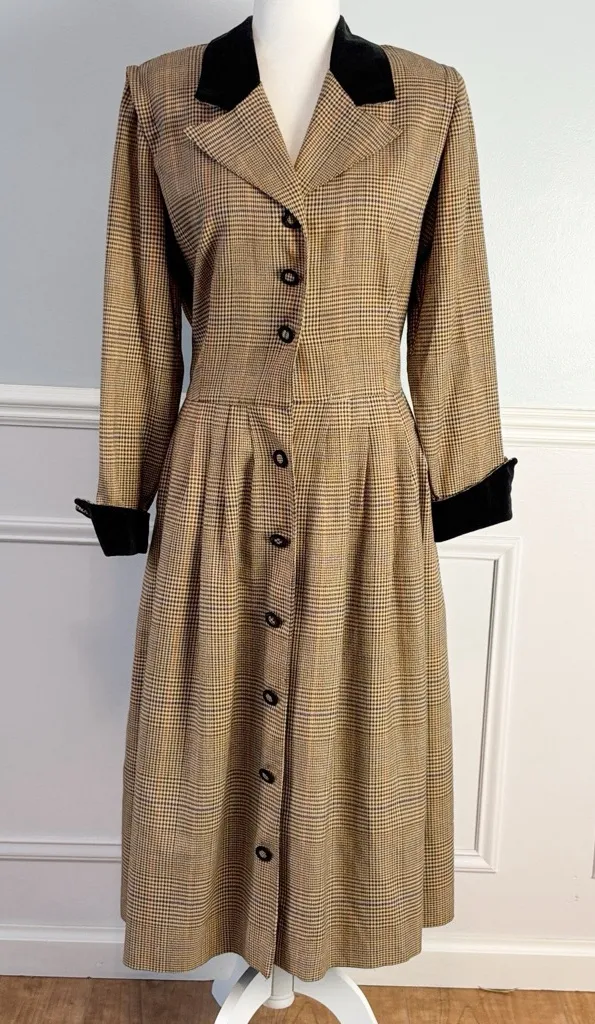 1960s Howard Wolf Brown Houndstooth Coat Dress Vintage Old Money Sz 16 Formal GREAT CONDITION; hook closure is missing at the waistline. A safety pin has been added for closure. Please see the last two photos. * BRAND: Howard Wolf * SIZE: 16 * Smart tailored button up coat dress in classic brown and orange houndstooth! * Features an A line silhouette, padded shoulders, velvet collar, and covered buttons. * Looks great buttoned or open as a duster! * Lightweight, made of rayon. * Sadly, no pockets. * Lined skirt * Dry clean APPROX., FLAT LAY: * Underarm-to-underarm: 21" *Waist: 18" * Shoulder-to-hem: 46"