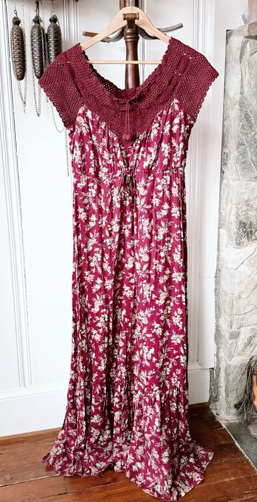 Excellent condition Crochet cap sleeves and yoke, ties at the empire waist and alines out from there. No size or material label Fits like a modern small Likely rayon with cotton crochet 19 inch ptp, 57.5 inch length Tags; retro boho cottagecore purple plum wine color doen vibes Christy Dawn vibes