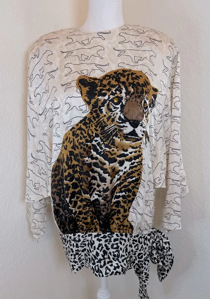 Beautiful 1980s Julie Francis Dolman Silk Blouse with Hip Sash and Leopard Print. Baby tiger is emb... Show more