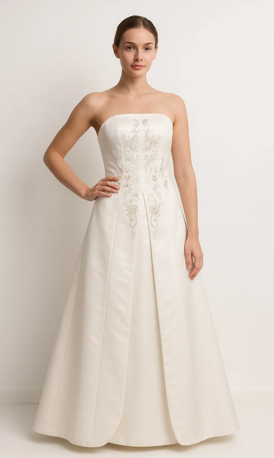 Elegant 1990s Jessica McClintock strapless formal gown in a soft ivory satin. Features ornate scrolling floral embroidery with subtle sparkle accents throughout the bodice and front panel. Classic A-line silhouette with structured bodice and full skirt for a timeless, flattering fit. Fully lined, professionally dry-clean only. Made in the USA. Beautiful choice for prom, bridal events, gala, or vintage formal wear lovers. Tagged size 4 fits like XS measurements are approximate •Length front 51” •Armpit to armpit across 14.5” •Waist across 13.5” Due to vintage sizes being different to modern sizing, please check your own measurements and compare before purchasing. In good vintage condition with minimal wear due to age. Any questions please ask •Five star seller •Same day shipping or next •Bundle discount available jessicamcclintock 1990sdress ivorygown straplessformal vintageformal embroideredgown eveningdress promdress bridalgown madeinusa