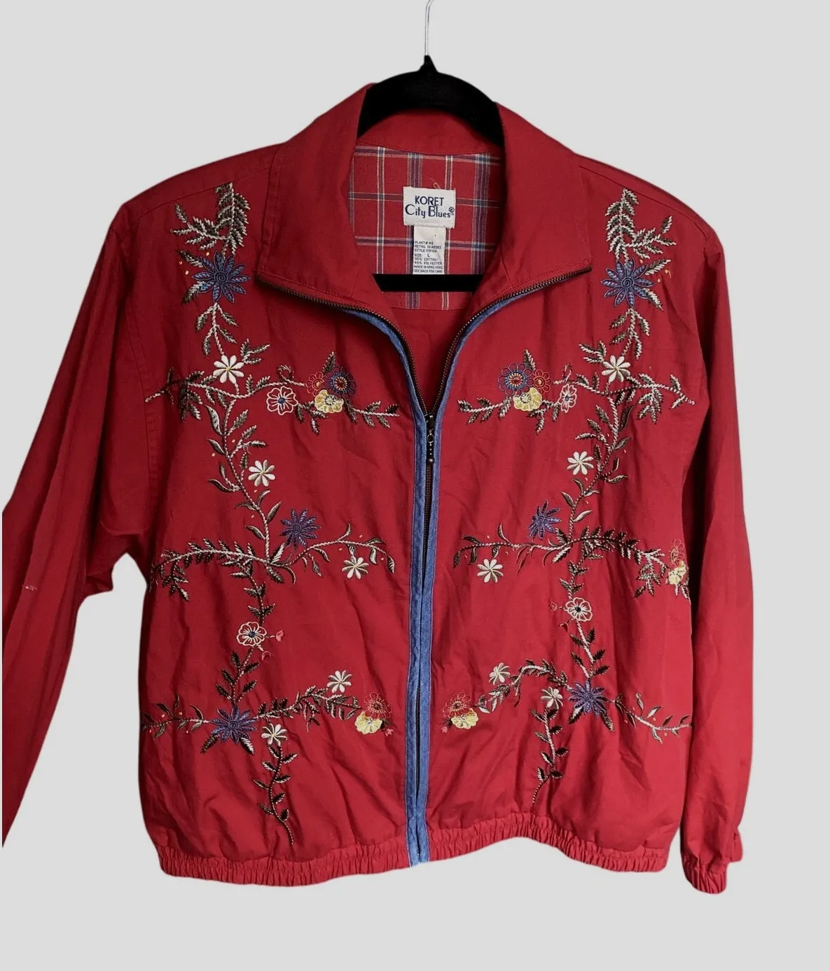 1990's Vintage Embroidered Floral Plaid Red Jacket Large Bohemian Folk Scandi Koret city blues zip-up bomber jacket with long sleeves and a slightly cropped fit. Cotton and polyester blend. Measures at 26" pit to pit, and 26" length from shoulder to hem. Red with green, blue, yellow, and white embroidered flowers and vines allover front, blue denim trim over zipper area, and partial plaid interior. Cinched sleeve cuffs and bottom. Brass zipper. Has shoulder pads. In excellent condition. Ships fast, highly rated seller! grannycore, scandigirl, grandma, nordic, folk art, scandinavian, layering, winter