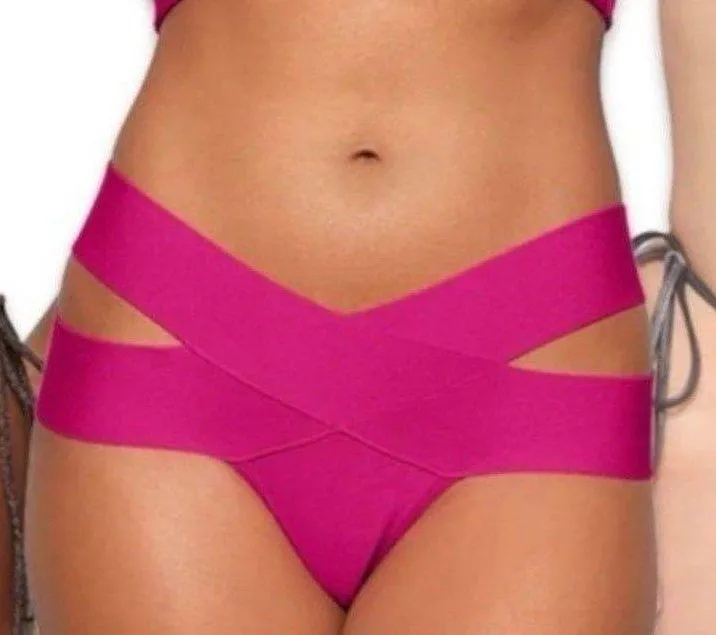 Skims Swim Knit Strappy Bikini Bottom Magenta Size 3X This sexy, playful bottom has thick criss-cross straps and cheeky back coverage. Features a dipped front waistband. Fits true to size. FIT & FABRIC This garment is not designed for wear in water. Dipped Front Waistband, Thick Criss-Cross Double Straps, Cheeky Back Coverage 80% Rayon / 20% Spandex