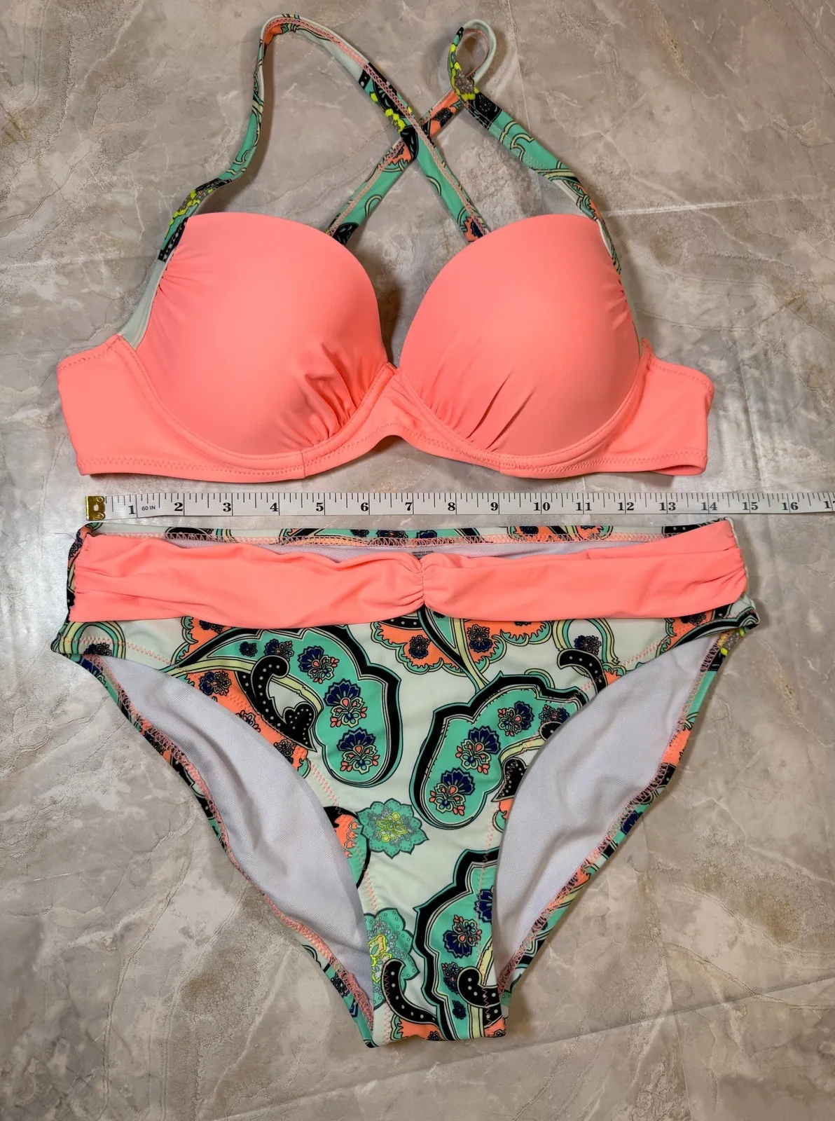 Turn heads this summer in this vibrant two-piece bikini featuring a bright peach top with crisscross adjustable back straps for a secure fit. The matching mid-rise bottoms offer full coverage and showcase a bold paisley print in turquoise, black, coral, and lime green. This flattering swimsuit is perfect for beach days, pool parties, and vacations. 🩱 Details: • Size: Medium • Padded bra • Adjustable crisscross back straps • Full-coverage bottoms with ruched waist detail • Hygienic liner still attached • 82% Nylon / 18% Spandex ✨ Great for tropical getaways, summer lounging, or swimwear collections.