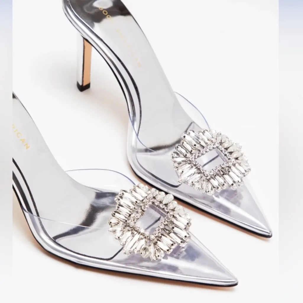 GOOD AMERICAN by Khloe Kardashian Cinder F*cking Ella Clear Mules Heels with stoneware silver crysta... Show more