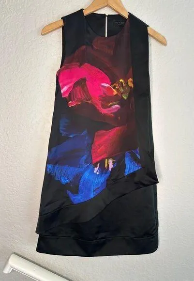 Ted Baker London Watercolor Black Dress Front flap drapes over stunning shift style dress by Ted Bak... Show more