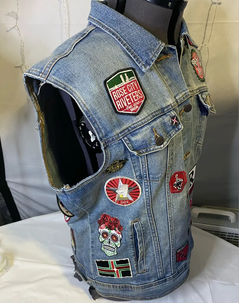 Blue denim vest featuring vibrant patches. Ideal for casual wear.