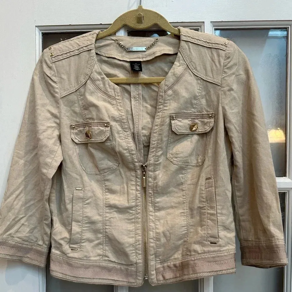 White House Black Market Linen Blend Tan Full Zip Utility Jacket Size 0 XS WHBM Great preowned cond... Show more