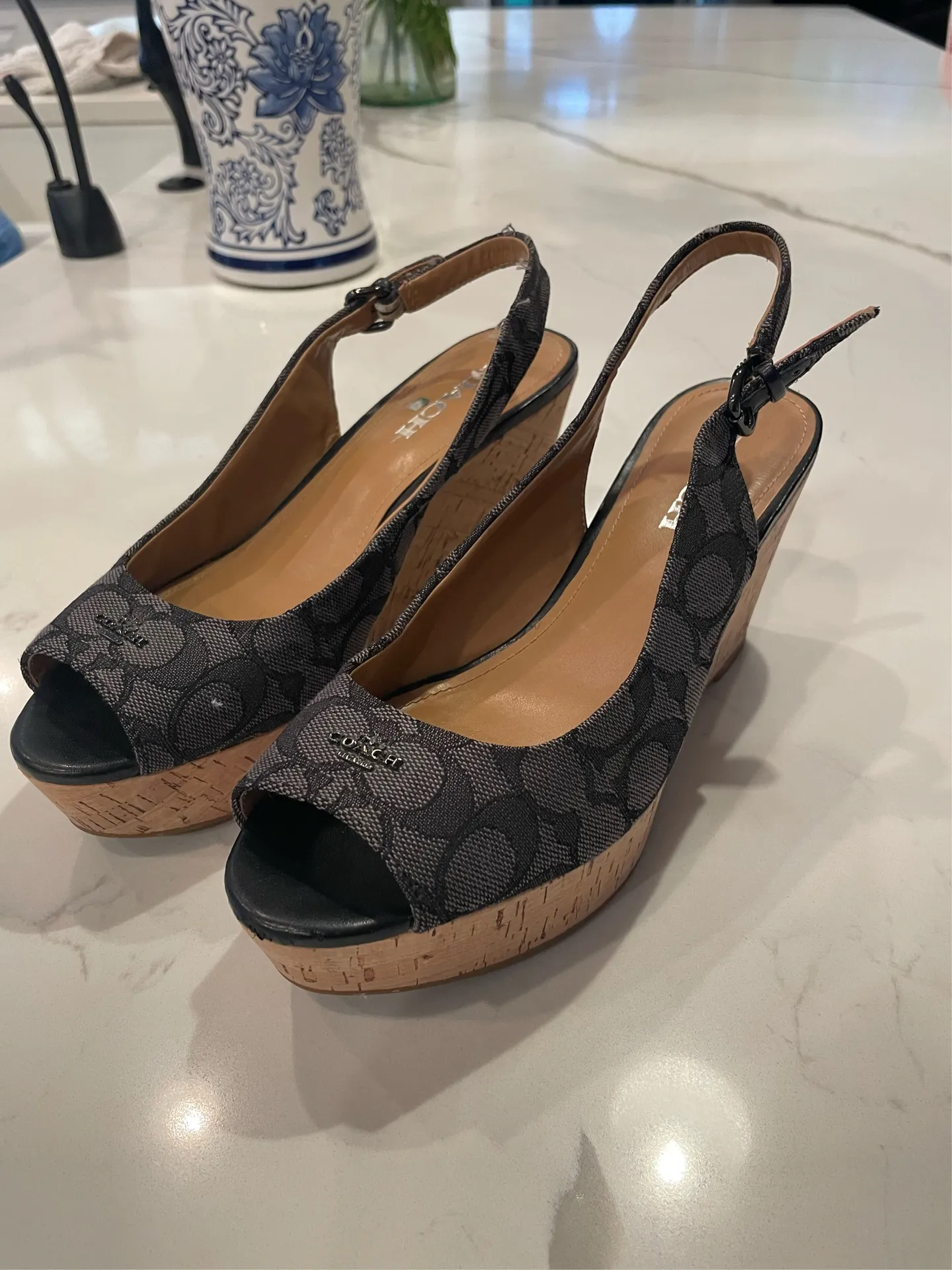 Fits true to size COACH SIGNATURE PRINT Cork Wedge Platform Slingback Sandals Womens size 8.5 FE... Show more