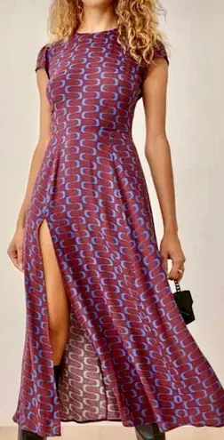 Reformation, Gavin dress, cutout dress, slit dress, midi dress, retro print dress, sustainable fashion, cocktail dress, date night dress, party dress, burgundy dress, festival style, evening outfit, open back dress, geometric print dress,